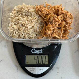- Weigh 4 oz. of Shredded Buffalo Chicken and measure 3/4 cup Brown Rice.