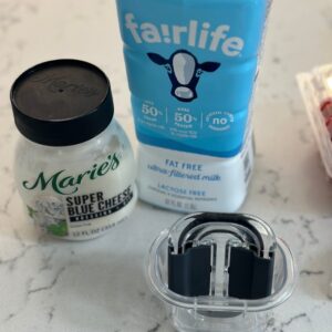 I like to use Fairlife Milk (2 tsp) and mix it with my blue cheese dressing (2 tsp) so that it mixes easier and I don’t have to use as much dressing. I’m also able to boost the protein and lower the amount of fat in the dressing this way.